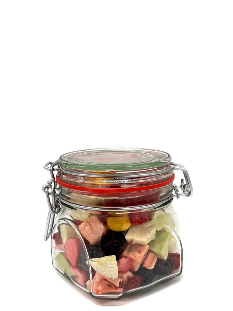 Fruchtvielfalt im großen XL Glas – natürlich, nachhaltig, lecker. Das großzügige Vorratsglas ist nicht nur ein Blickfang in jeder Küche, sondern auch besonders praktisch: Es schützt die gefriergetrockneten Früchte zuverlässig vor Luftfeuchtigkeit und bewahrt ihr intensives Aroma. Ideal für Vielgenießer – immer griffbereit und nachhaltig verpackt. Im Glas steckt eine abwechslungsreiche Mischung saisonal ausgewählter Früchte.