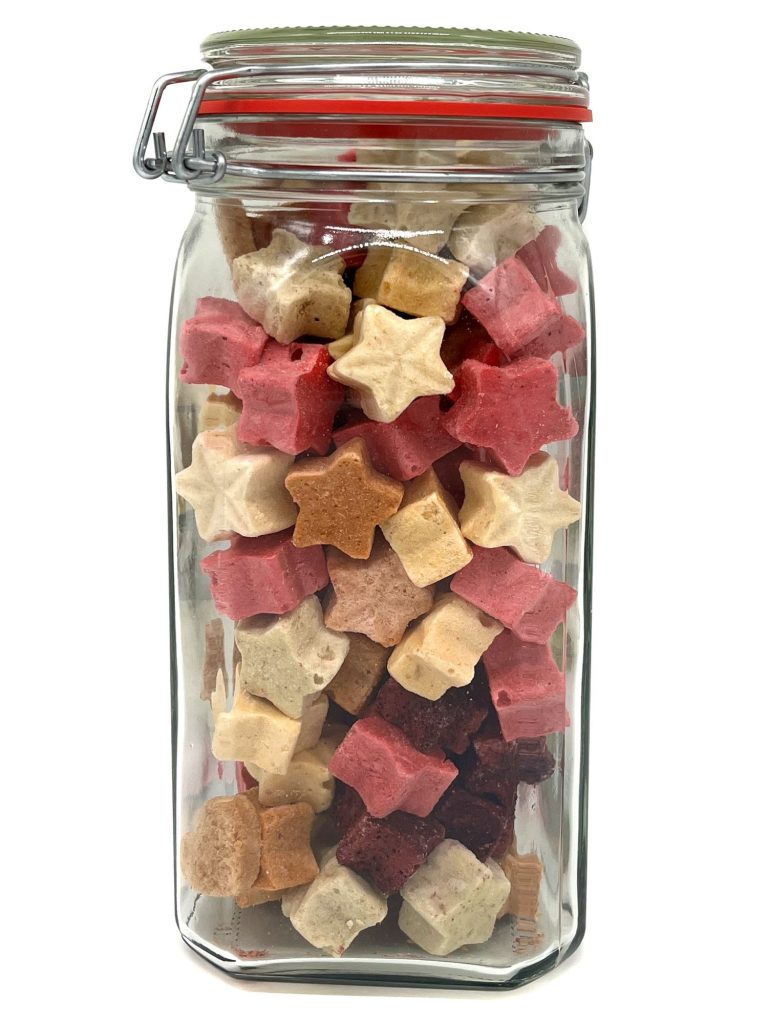 Unsere beliebten Fruchtsterne – kleine, gefriergetrocknete Sterne aus purer Fruchtpüree-Mischung – kommen jetzt im praktischen XXL-Glas. Die dekorative Sternform macht sie nicht nur zu einem fruchtigen Genuss, sondern auch optisch zu einem Highlight. Das große Glas schützt die empfindlichen Sterne zuverlässig vor Feuchtigkeit und Licht, bewahrt ihr intensives Aroma und lässt sich nachhaltig wiederverwenden. Hergestellt aus saisonal variierenden Früchten und schonend gefriergetrocknet – für natürlichen Fruchtgenuss in seiner schönsten Form.